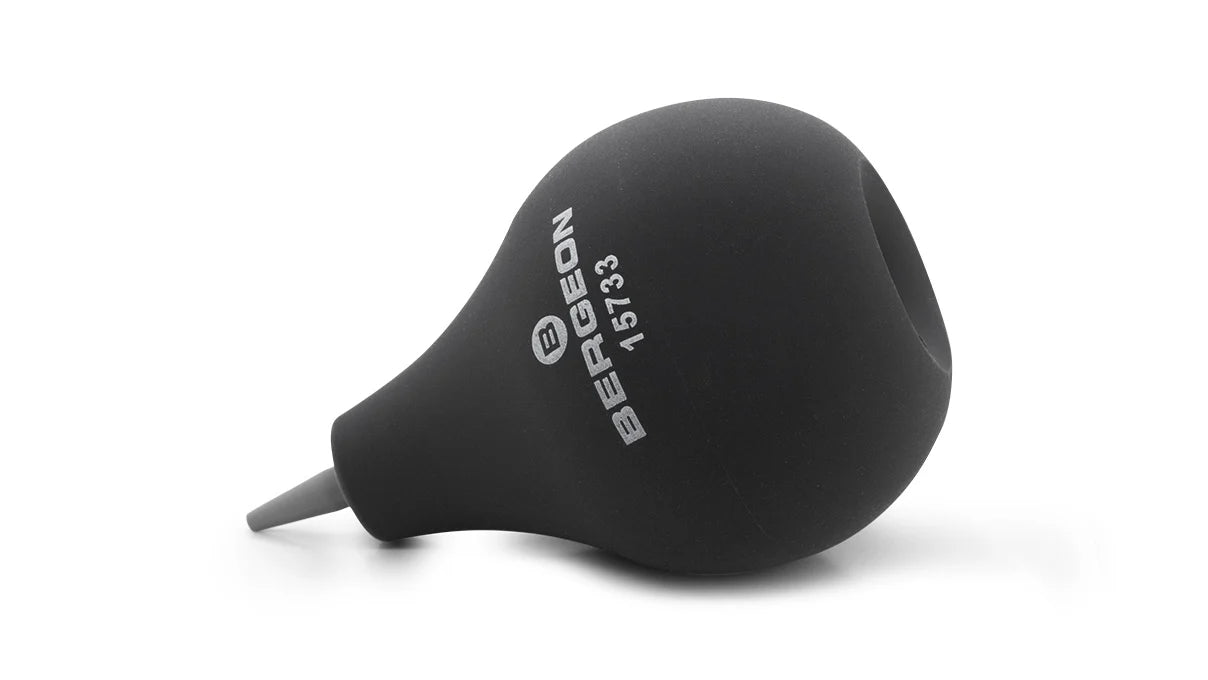 The Bergeon 15733 Rubber Dust Blower is a premium Swiss-made cleaning tool designed for professional watchmakers, jewelers, and precision technicians. This pear-shaped blower is ideal for safely removing dust particles from watch movements, cases, and delicate components without using moisture, chemicals, or direct contact.