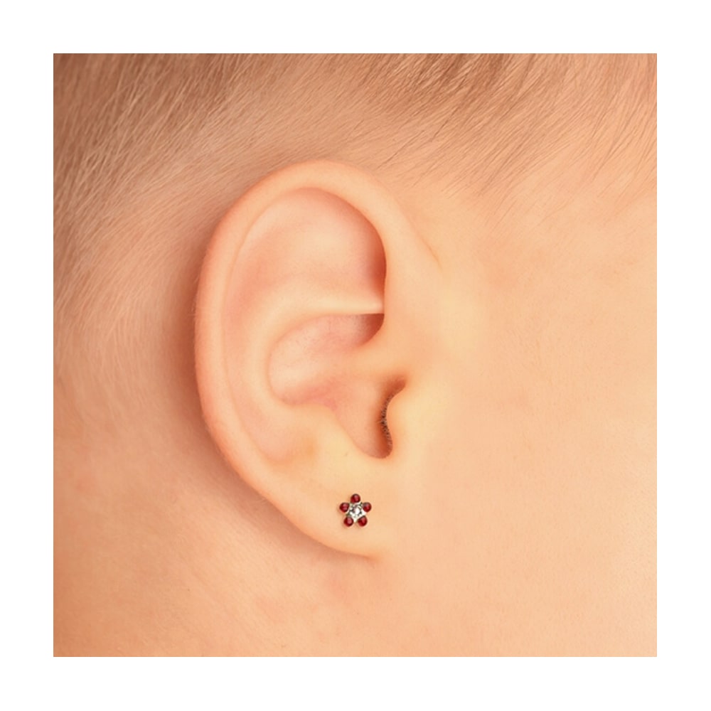 Introduce your little one to the world of elegance with the Studex Gold-Plated Baby Daisy Ruby Earrings, a charming accessory that combines style, safety, and sophistication. Featuring a delicate daisy design with a vibrant ruby center, these 3mm earrings are perfectly sized for children, making them an ideal choice for everyday wear or special occasions.